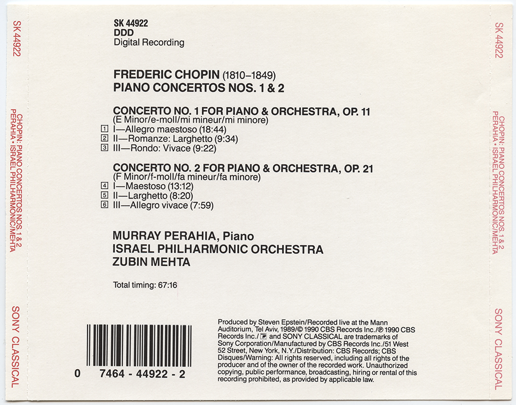 Perahia, Murray; Mehta, Zubin; Israel Philharmonic Orchestra : Chopin: Piano Concertos Nos. 1 & 2 (V001)