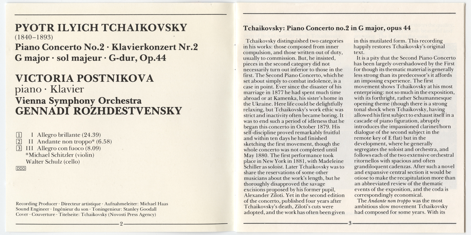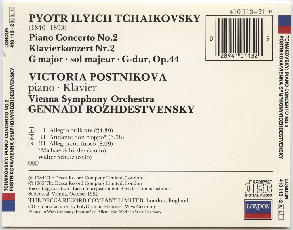 Postnikova, Victoria; Rozhdestvensky, Gennadi; Vienna Symphony Orchestra : Tchaikovsky: Piano Concerto No. 2 (V001)
